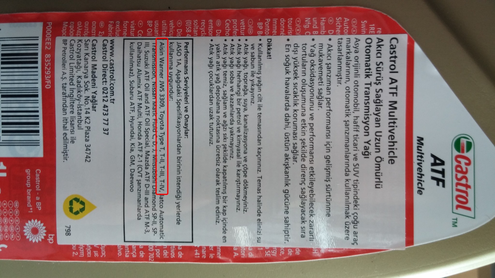 Şimdi UFUK abiyle konuştuk. Kafamı kurcalayan 5 LT yağın, şanzıman yağı değişimi yaparken sağlıklı olup olmayacağıydı.TOYOTA da sağolsun çakallık yaparak 5 LT yağ üretmiş. Sağlıklı bir değişim istiyorsak varsa 1 LT daha, yoksa 5 LT daha TOYOTA TYPE T-IV alacaktım. 5 LT'sinin fiyatı 38,00 TL iken, 1 LT'liği ne kadar acaba ?UFUK abiden T-IV normlarını karşılayan, TOYOTA ile uyumlu 6 LT(1 LT'lik ambalajda-6 adet) Castrol ATF Multivehicle siparişi verdim.TOYOTA TYPE T-IV'den daha hesaplıya geliyor ve aynı gereksinimleri karşılıyor, hem de yağ değişimi daha sağlıklı olacak. Önemli olan da bu zaten.CASTROL'un sitesinden yapıştırdım.