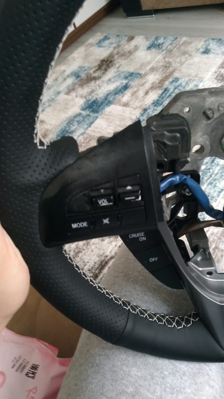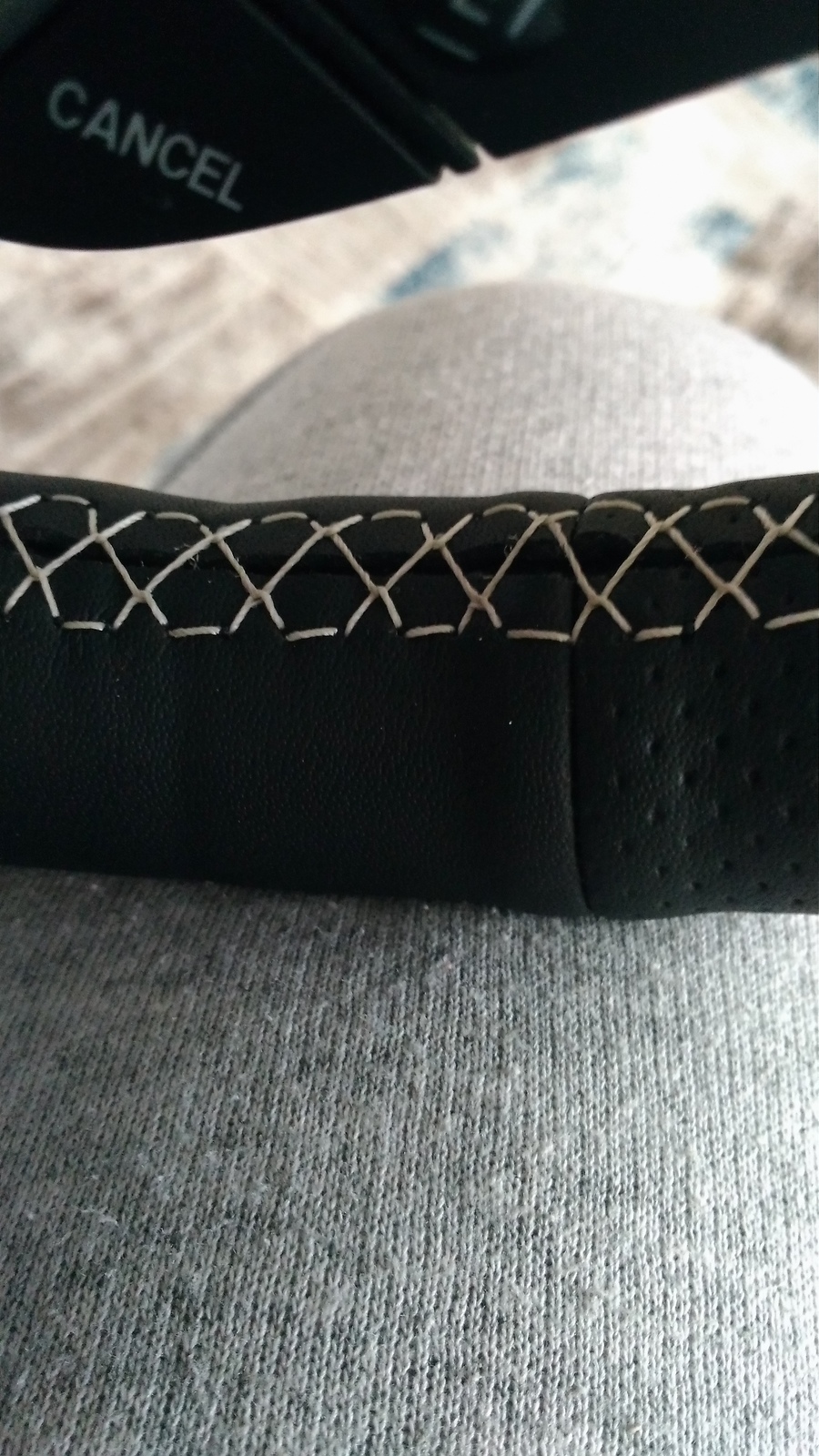Direksiyona kılıfı geçirip hizalıyoruz ve tam düzgün olduğundan emin oluyoruz. Ürünle gelen uygulama yönergesinde öncelikle tüm kenarlara beraberinde gelen çift taraflı bant ile yapıştırılması gerektiği söyleniyordu. Ben de saf gibi yaptım bir güzelce vakit kaybettim. Neyse ki çift taraflı bant çok ince ve köpük değil, çekince hemen çıkıyor. Deri sanırım bazı yerlerden olması gerekenden dar kesilmiş. Bu nedenle dikmeye başladıktan sonra farkettim ki arada boşluk kalıyor. Beğenmedim yaptığım işi söktüm tamamen ve yapışkan bantların çoğunu çıkarttım. Bu yapışkan derinin ip sayesinde gerilmesini engellediğini düşündüğüm için çıkardım ki sanırım haklıydım.