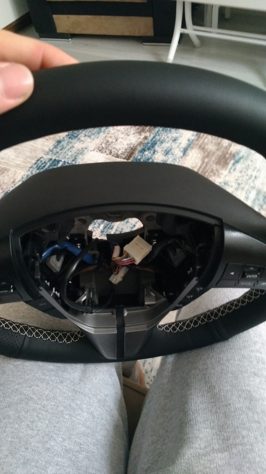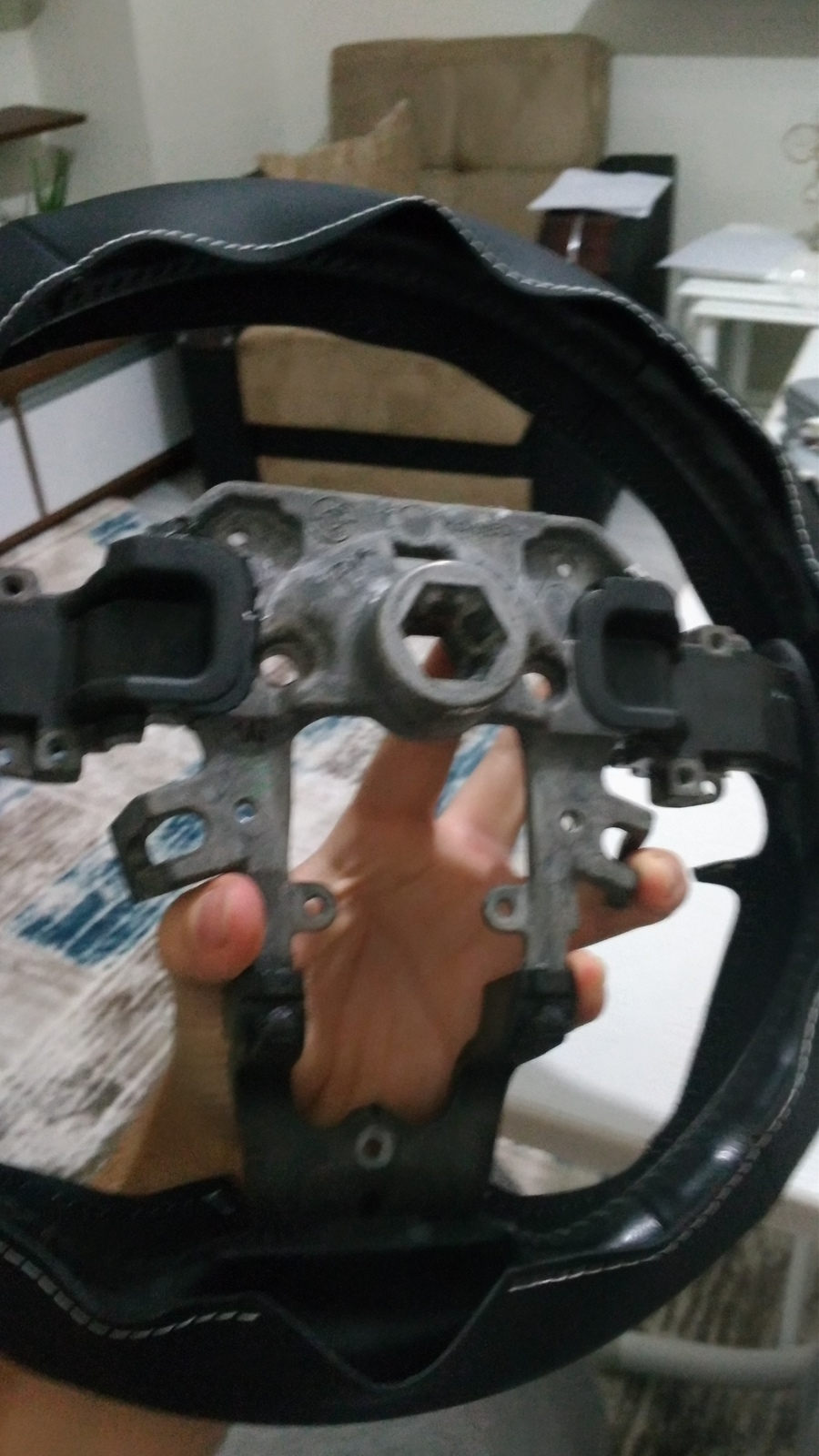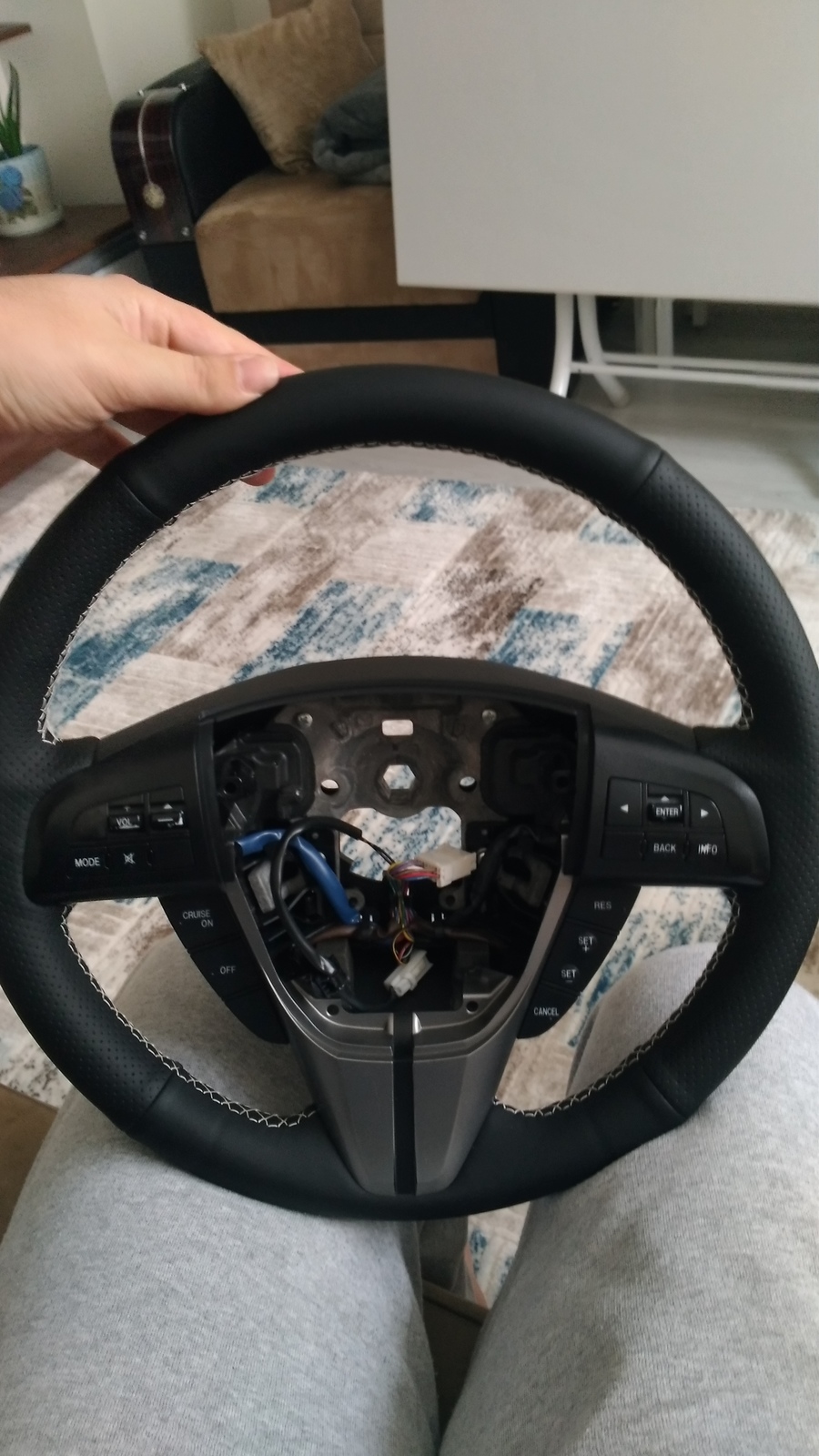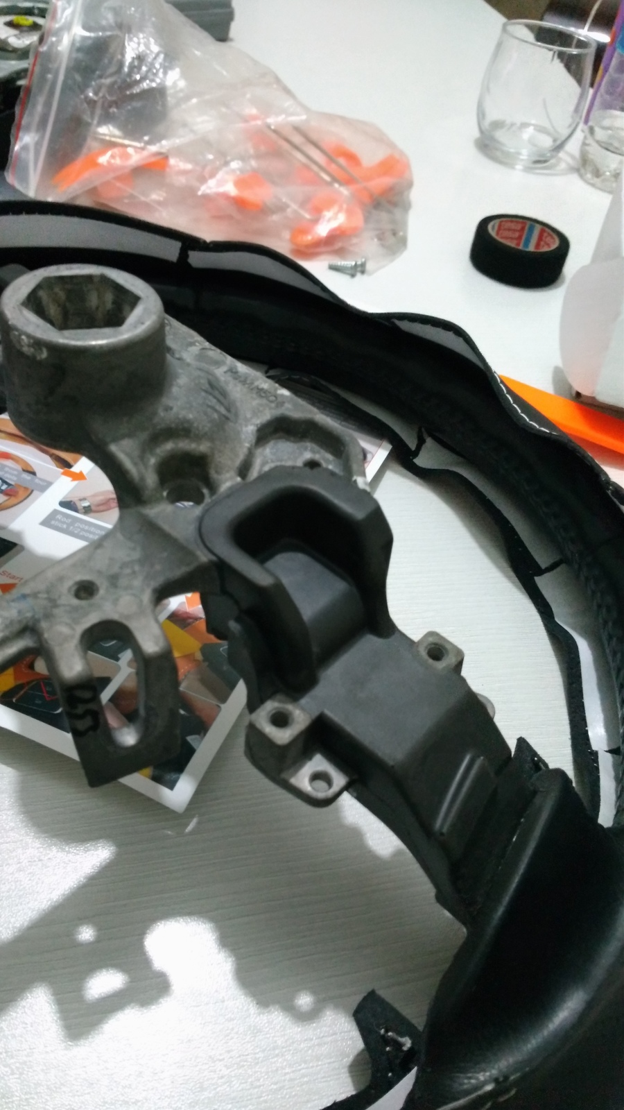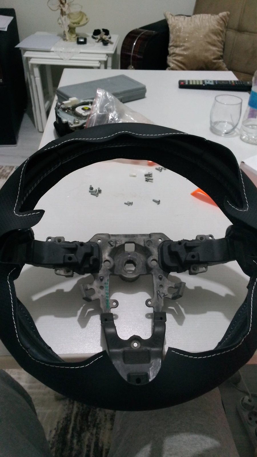 https://tr.aliexpress.com/item/Black-Leather-Car-Steering-Wheel-Cover-for-2011-2013-Mazda-3-Mazda-CX7/32286084992.html?spm=a2g0s.9042311.0.0.l5XLksDireksiyonu araçtan söküp direksiyon üstündeki tüm herşeyi çıkardıktan sonra kılıfı dikmeye hazırız.
